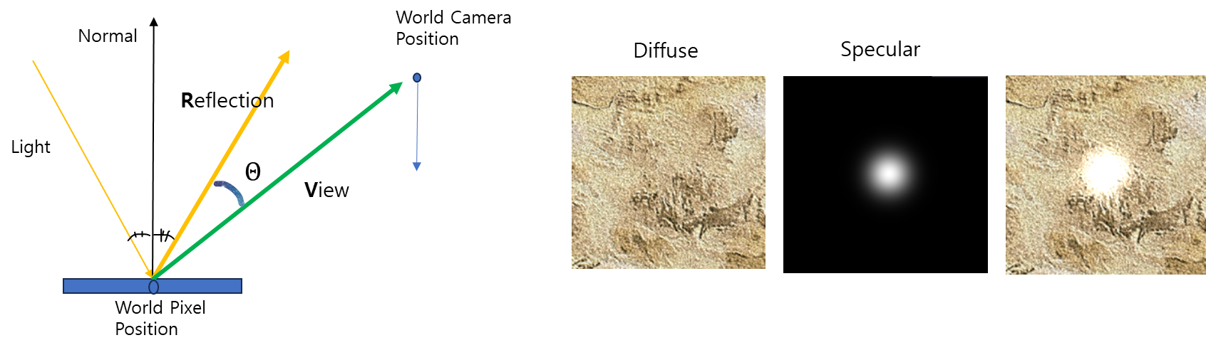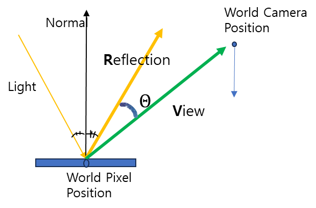 - 입사각 = 반사각 조건을 만족할 때 카메라 쪽으로 강한 빛이 보임