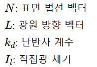 - 표면이 빛을 얼마나 정면으로 받는지에 따라 세기가 달라짐 (법선과 광원 방향 각도에 의존)