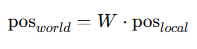 여기서 는 월드 행렬(World Matrix)으로, 위치, 회전, 크기 정보를 모두 포함한다.
