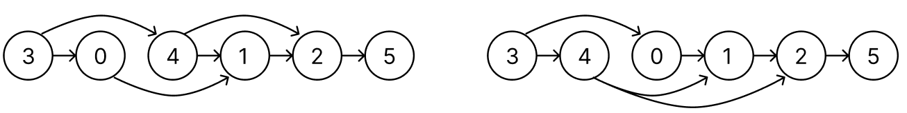위상 정렬 결과 하나의 DAG에서 하나 이상의 위상 순서(Topological order)가 나올 수 있으며 모든 간선은 오른쪽만 가리키게 된다.
