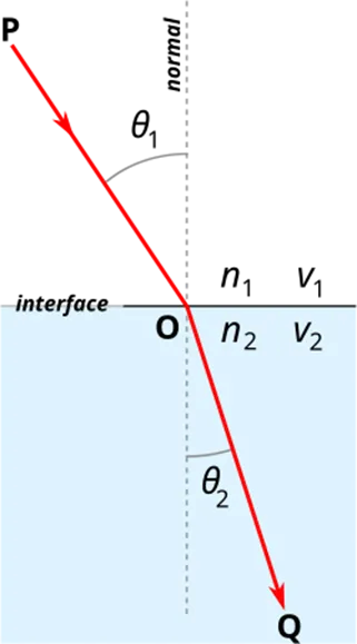 빛이 매질 1에서 매질 2로 들어갈 때, 입사각과 굴절각 사이에는 다음 관계가 있다.
