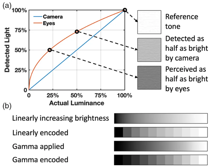 sRGB는 사람 눈의 특성을 반영한 감마 곡선(약 2.2) 으로 인코딩되어 있다.